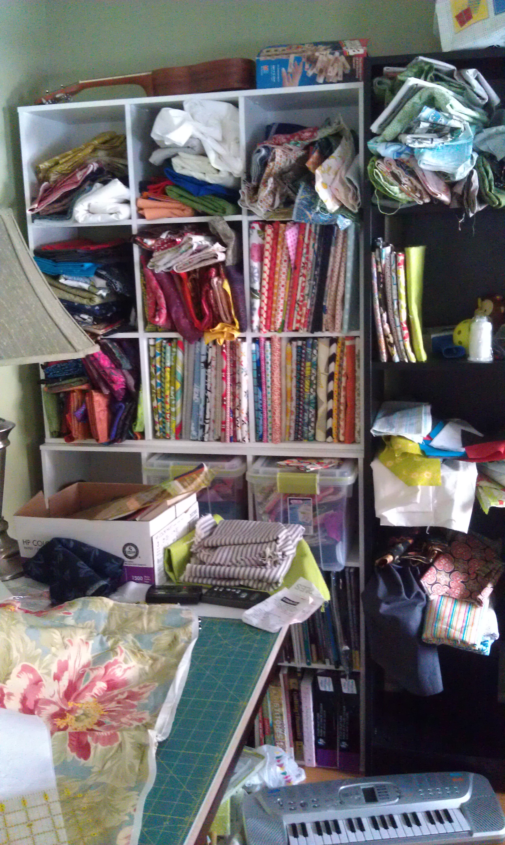 So I’ve booted the kids out of the playroom with windows and moved my sewing room up from the basement (without windows). This has been most definitely an improvement. In the process, I have also been working through my stash, folding it using the comic board technique, and generally just reminding myself what I have. Japanese prints (collectibles! vintage!), lots of batiks I found from an estate sale, fat quartes from when I was just starting out to quilt, “modern” fabrics ( a bit more on this weighty topic below), kiddy fabrics… they’re all getting a look. And the folding continues at a glacial pace because, well, folding is boring when done all at once.